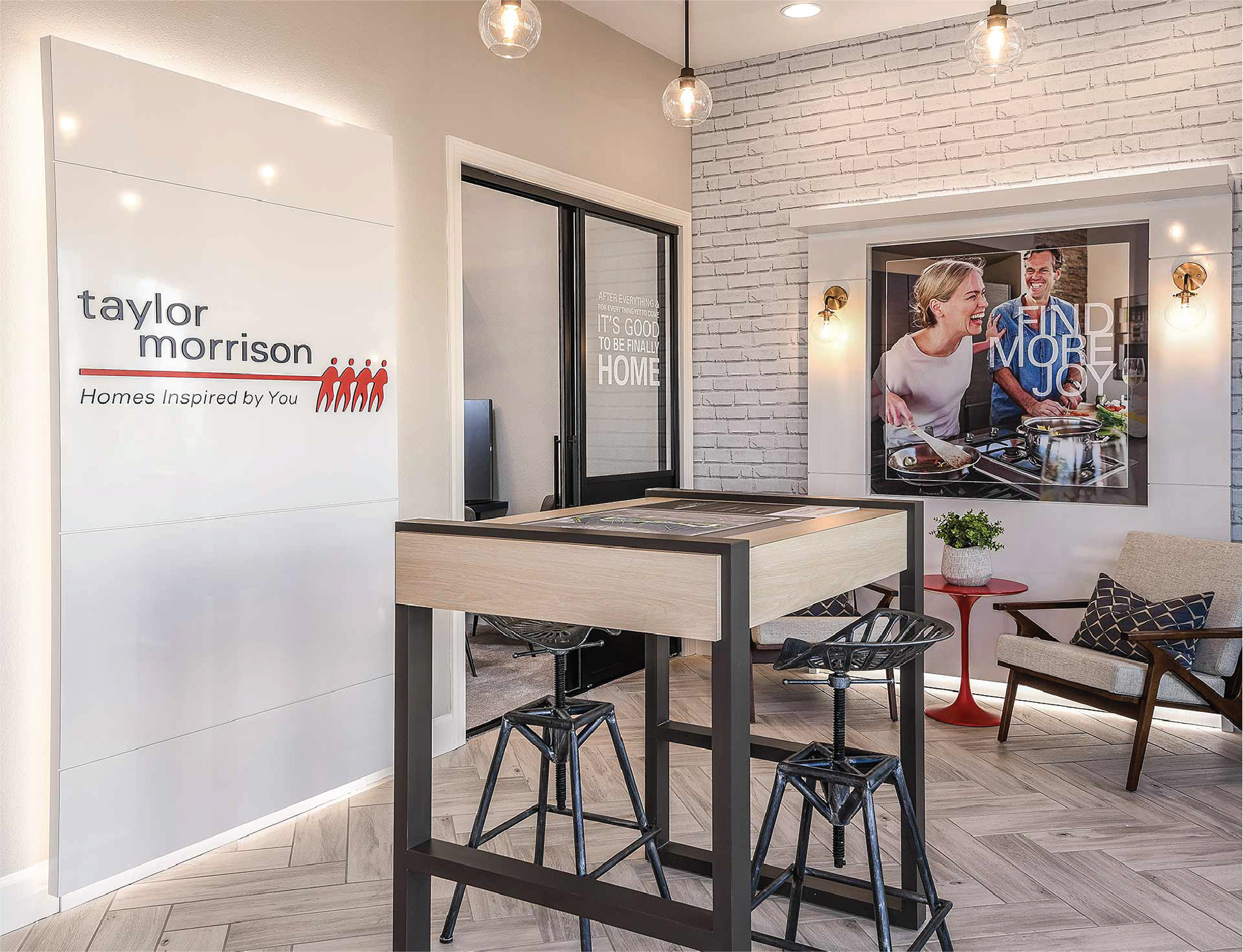 Sales center showroom with wall displays, cut lettering and custom furniture.
